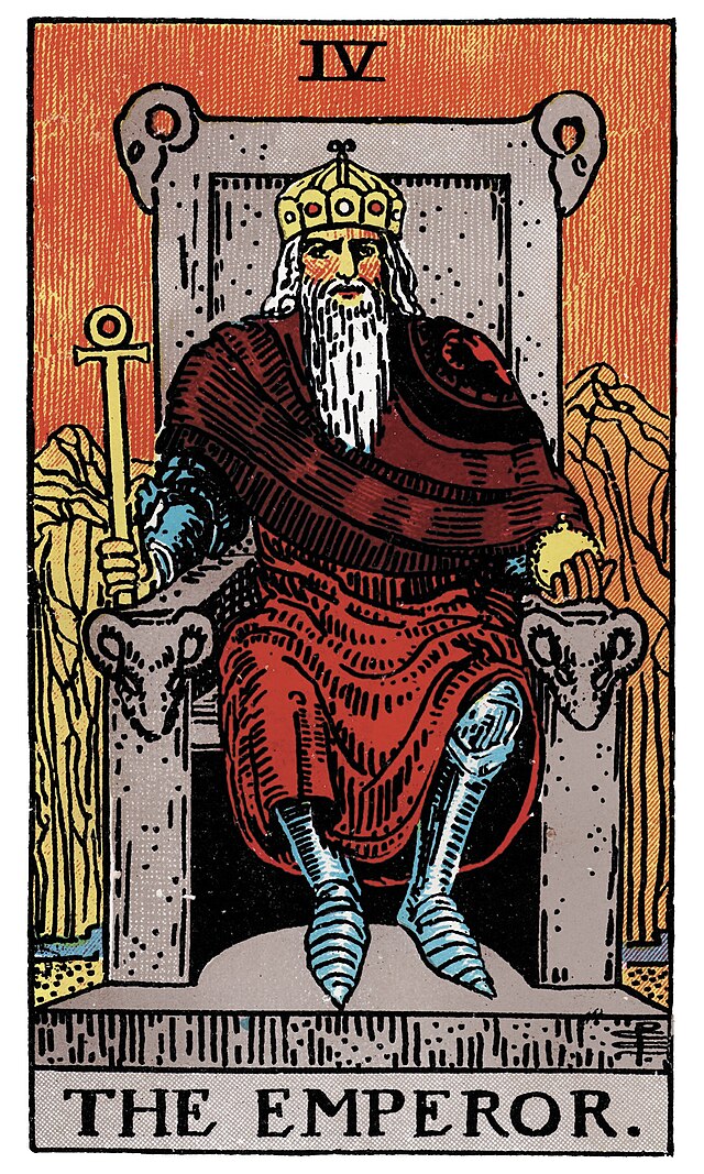 O trono costuma ser adornado com cabeças de carneiro, símbolo direto de Áries e de suas associações com liderança, determinação e impulso inicial. Em suas mãos, o Imperador segura um cetro, representando domínio e controle, e um orbe, símbolo de sua autoridade sobre o mundo material.