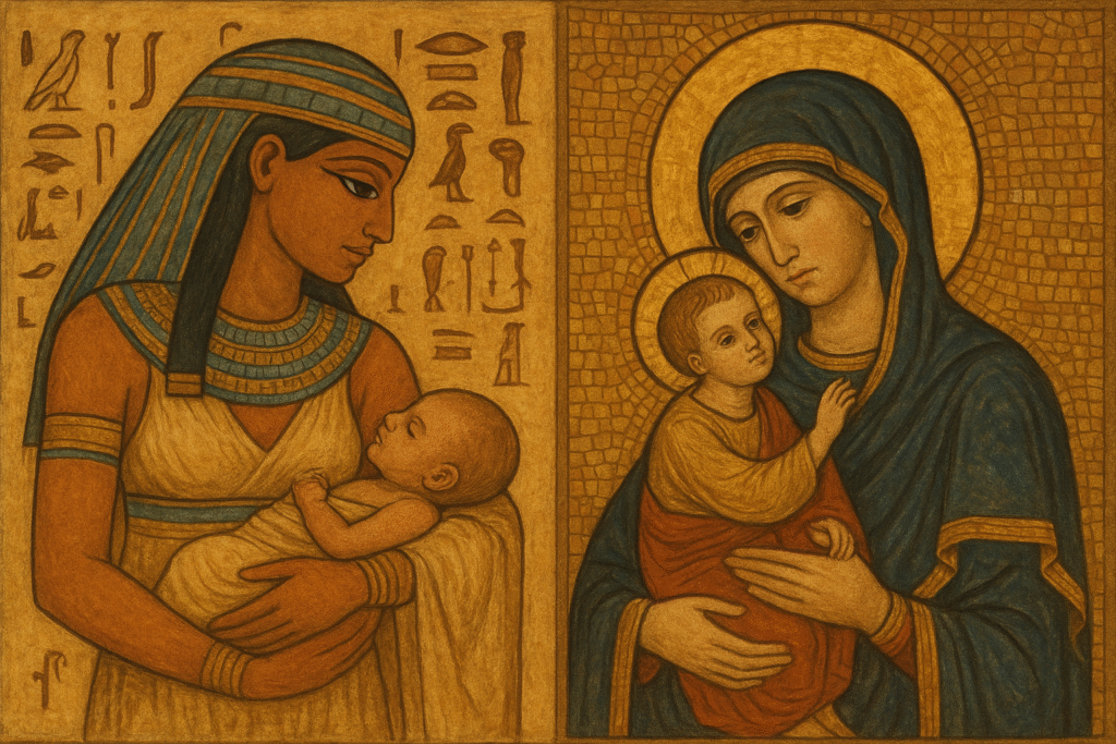 Diversos estudiosos têm apontado paralelos entre a veneração da Virgem Maria no cristianismo e o antigo culto à deusa Ísis no Egito, sobretudo no período final do Império Romano. Quando o cristianismo começou a se expandir pela Europa, muitos convertidos já estavam familiarizados com a imagem de Ísis amamentando Hórus. Por isso, não é raro encontrar representações de Maria com o Menino Jesus que ecoam a mesma iconografia, como reconhecem egiptólogos modernos.