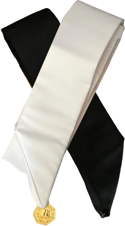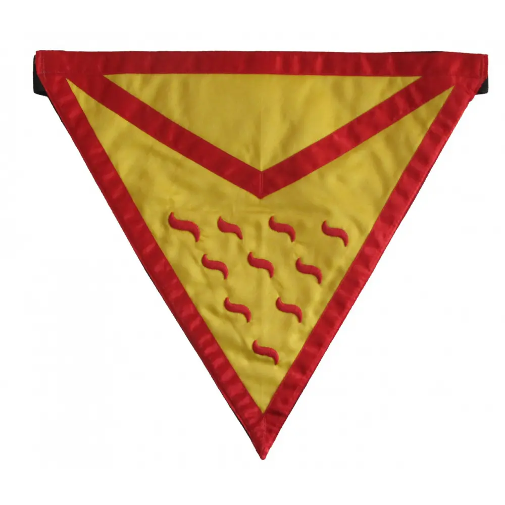 O avental do grau é triangular, de cetim amarelado com bordas carmesim, representando dignidade, coragem e luz.