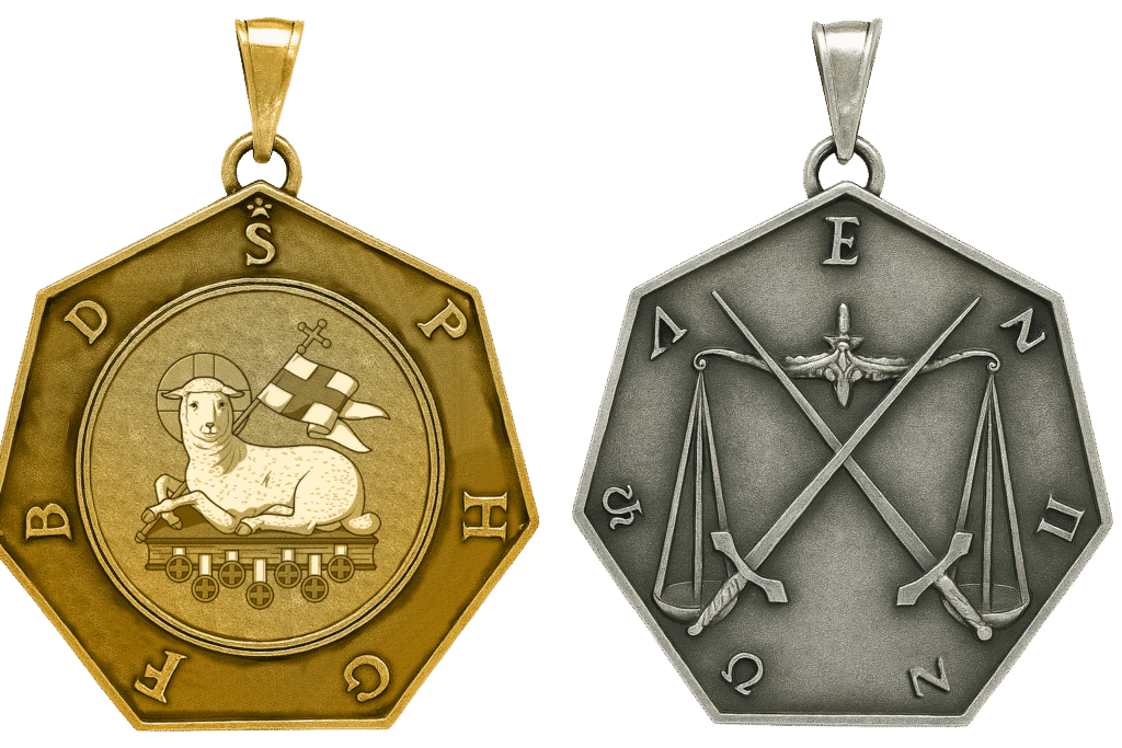Na frente da joia, há a imagem do cordeiro com o livro dos sete selos, e no verso, duas espadas cruzadas sobre uma balança, símbolo do equilíbrio e da justiça.