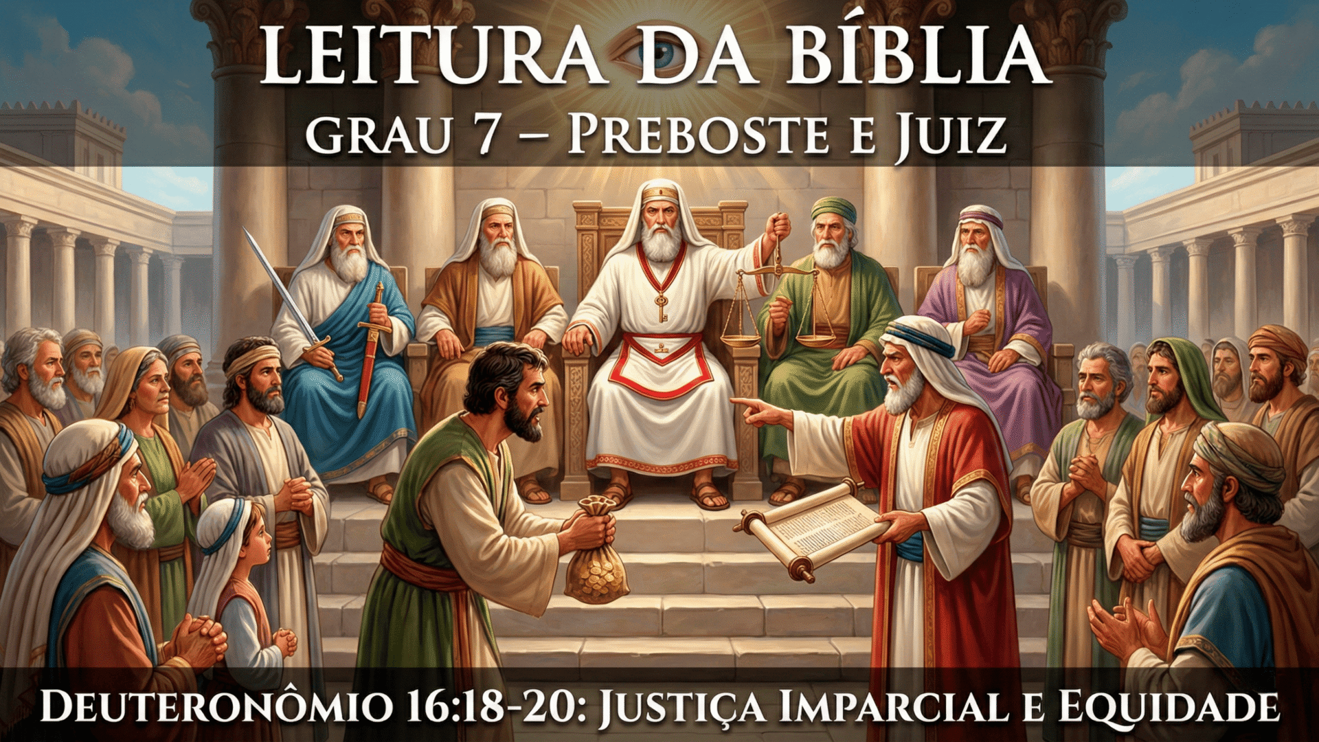A leitura de Deuteronômio 16:18–20 no Grau 7 destaca a justiça imparcial como dever do Maçom. O Preboste e Juiz aprende a agir com retidão, equilíbrio e ética, tornando-se guardião da verdade e da fraternidade na construção interior do Templo.
