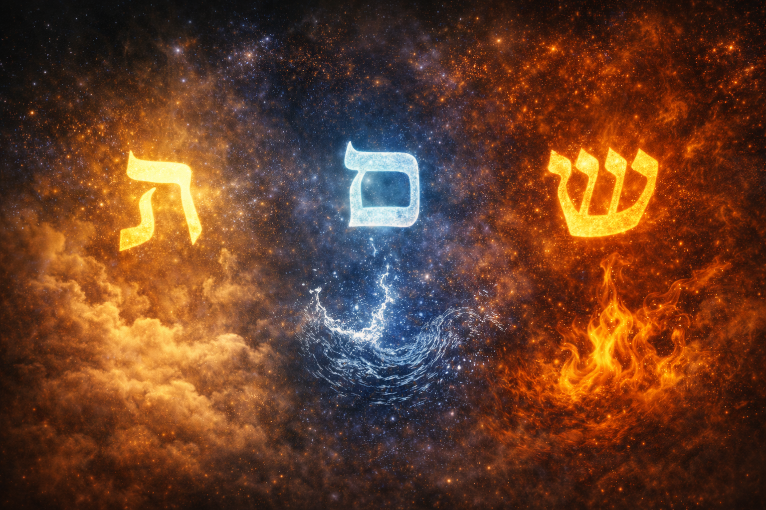 Aleph simboliza o Ar e expressa equilíbrio e movimento. Ele representa o sopro essencial que separa, une e harmoniza. Mem corresponde à Água e descreve o abismo primordial, o potencial puro, a matriz da vida em estado embrionário. Já Shin representa o Fogo, a energia criadora, o impulso que transforma o possível em real.