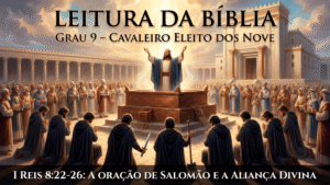 A leitura de I Reis 8:22–26 no Grau 9 revela Salomão como exemplo de liderança justa, fundada na fidelidade à aliança divina. O Mestre Eleito dos Nove aprende que o verdadeiro poder nasce da consciência, da retidão e do compromisso com a luz e a justiça.
