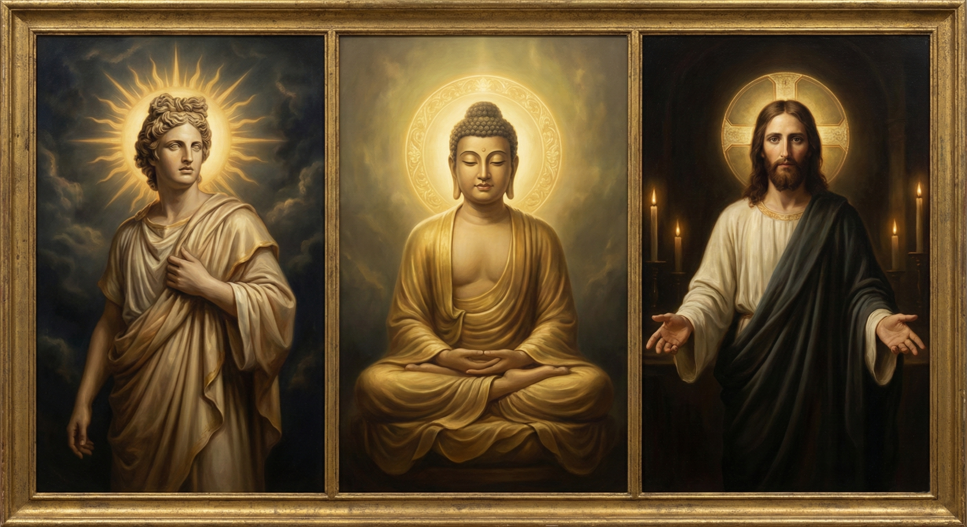 A imagem é onipresente: Jesus, Maria e os Santos retratados com um disco dourado atrás da cabeça. Para a teologia cristã, isso indica santidade, uma luz divina que separa o sagrado do profano.