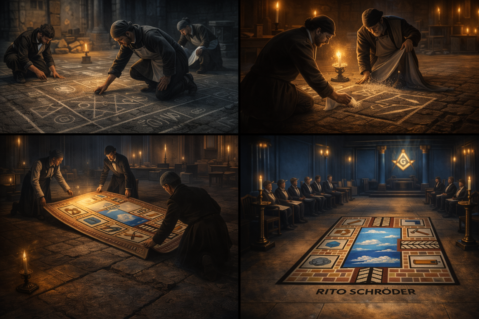 Em muitos ritos, essa prática evoluiu para os Painéis dos Graus ou Tábuas de Delinear, fixados nas paredes. O Rito Schröder, entretanto, preservou o costume antigo. Essa preservação não se deu por apego folclórico, mas por coerência doutrinária. O Tapete, colocado no chão e circundado pelos Irmãos, mantém viva a ideia de oficina de trabalho. Ele representa a planta da construção e o campo onde se aplica a Geometria moral.